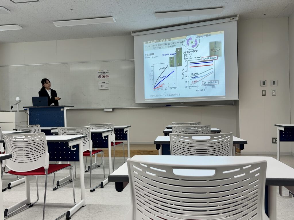 - 村尾明日香 (B4):金属イオン錯体を架橋点とするTetraPEGイオンゲルの力学特性制御:金属イオン種依存性