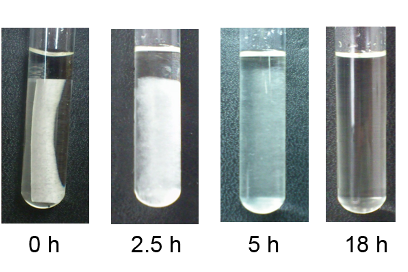 この研究では、セルロースのような本来不溶な物質群を常温で速やか且つ大量に溶解するための媒体として “機能を付加した電解液” に着目し、高分子溶媒和の化学を応用することでセルロースの溶存状態を分子レベルで制御することを目指していきます。下に示す写真は成果の一例であり、イオン液体をベースとする機能性電解液中にセルロースを主成分とする濾紙が常温で溶解していく様子です。